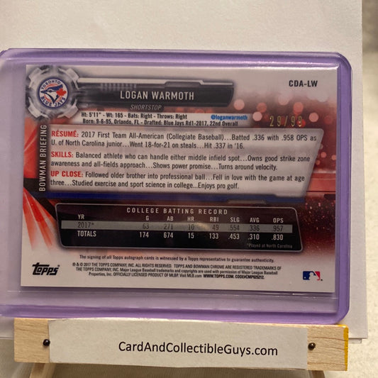 2017 Bowman Chrome Logan Warmoth Green Autographed trading card