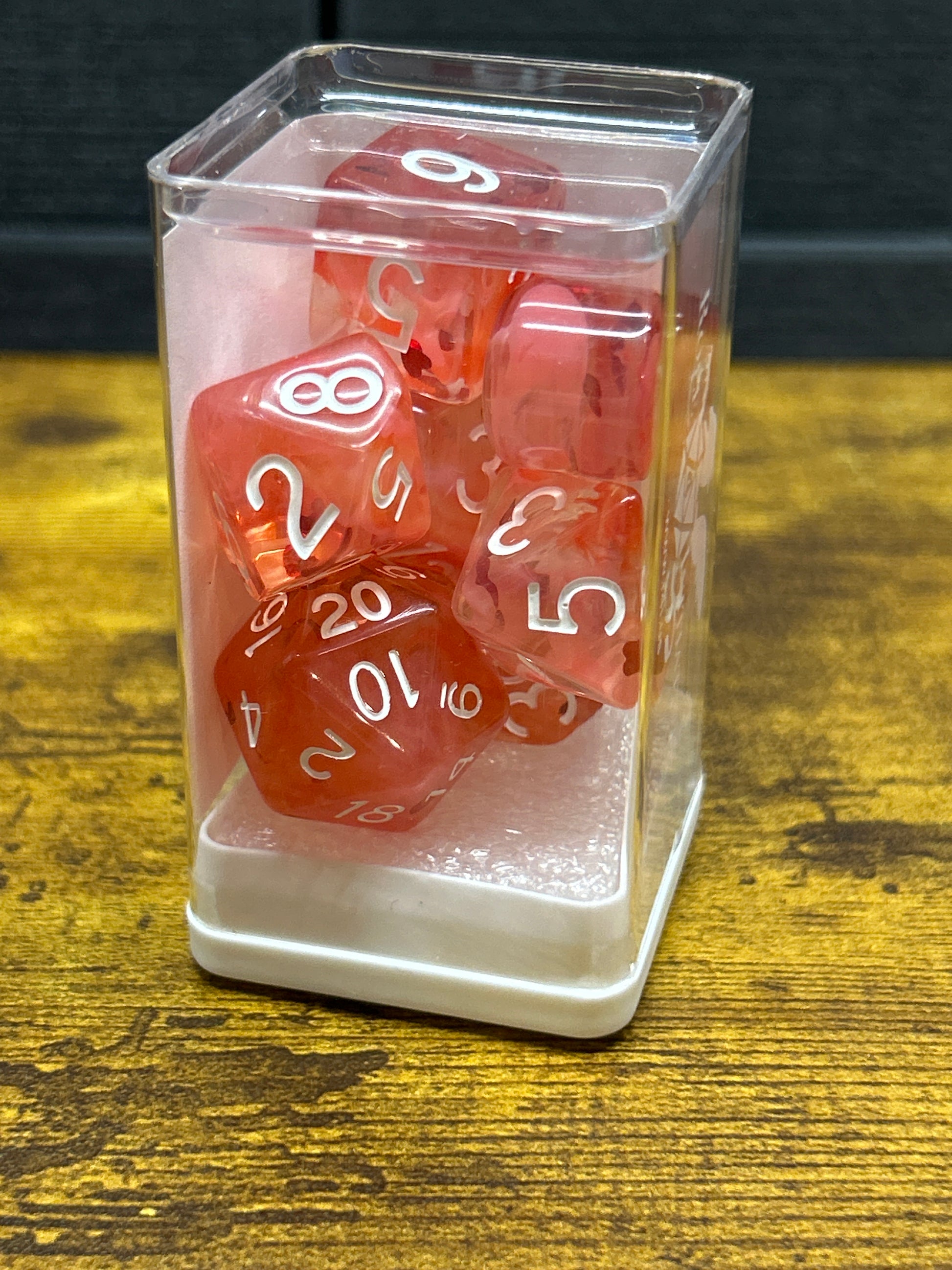 7-set “Lovestruck” RPG Dice by Role 4 Initiative. 1d20, 1d%, 1d12, 1d10, 1d8, 1d6, Arch’1d4. Semi-clear red dice with red heart glitter.