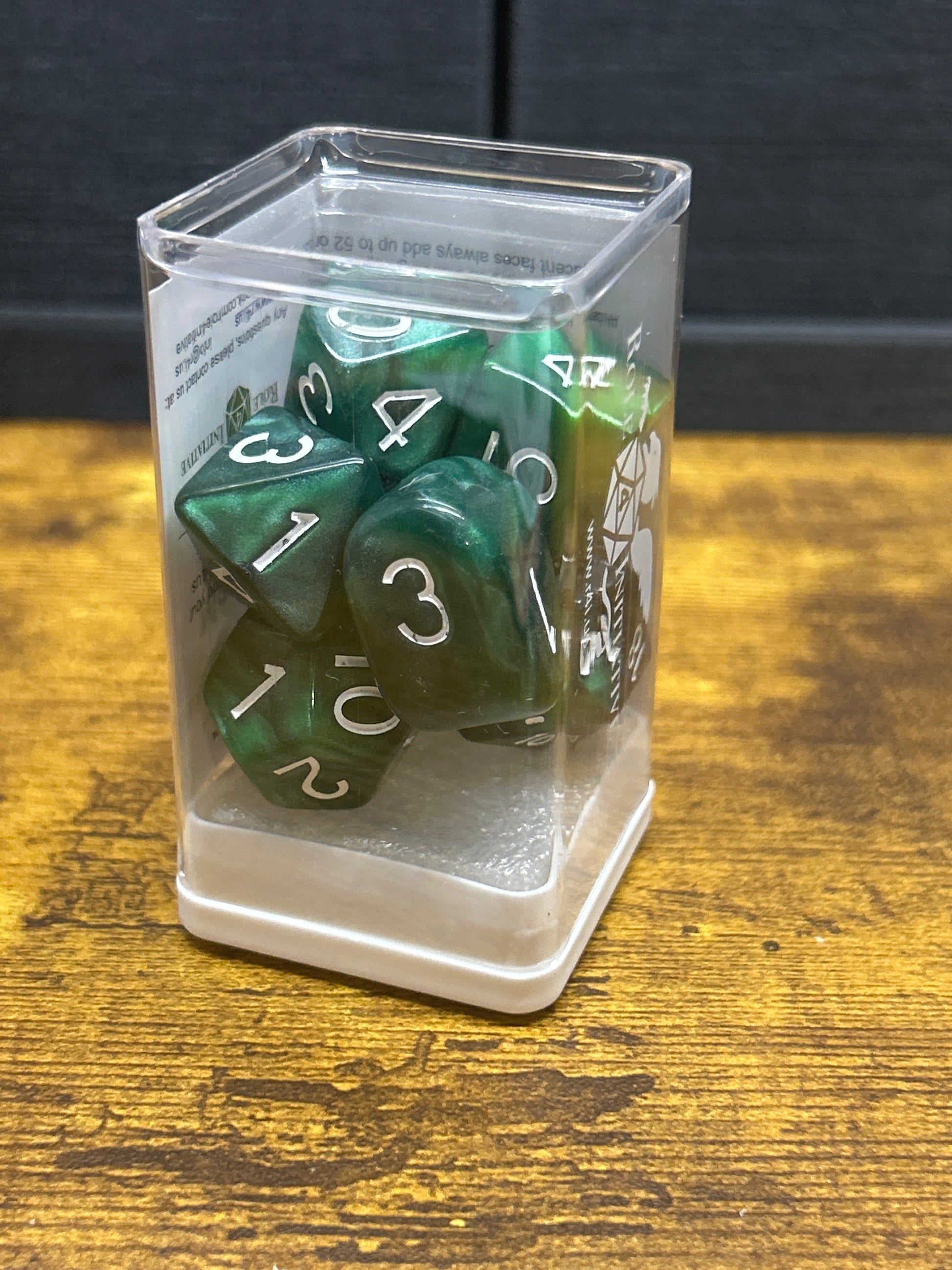 7-set “Marble Green” RPG Dice by Role 4 Initiative. 1d20, 1d%, 1d12, 1d10, 1d8, 1d6, Arch’1d4.