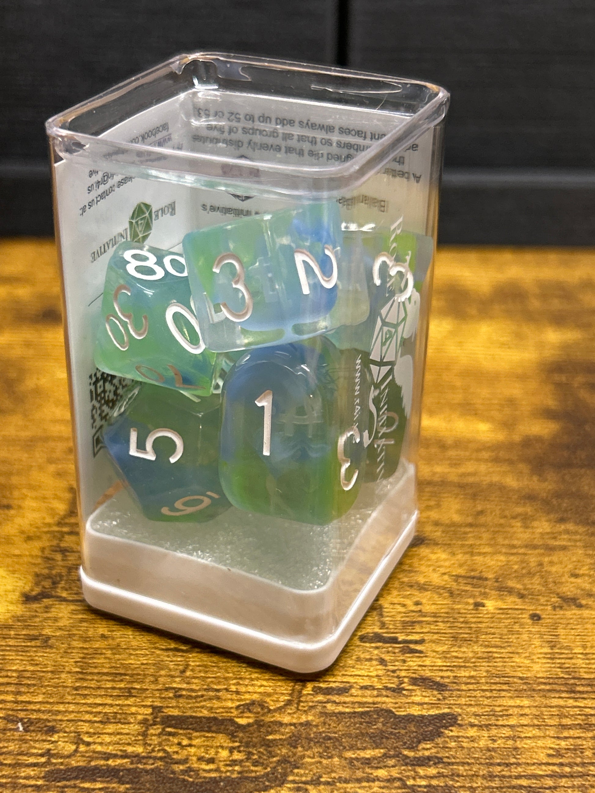 7-set “Nixie’s Brook” RPG Dice by Role 4 Initiative. 1d20, 1d%, 1d12, 1d10, 1d8, 1d6, Arch’1d4.
