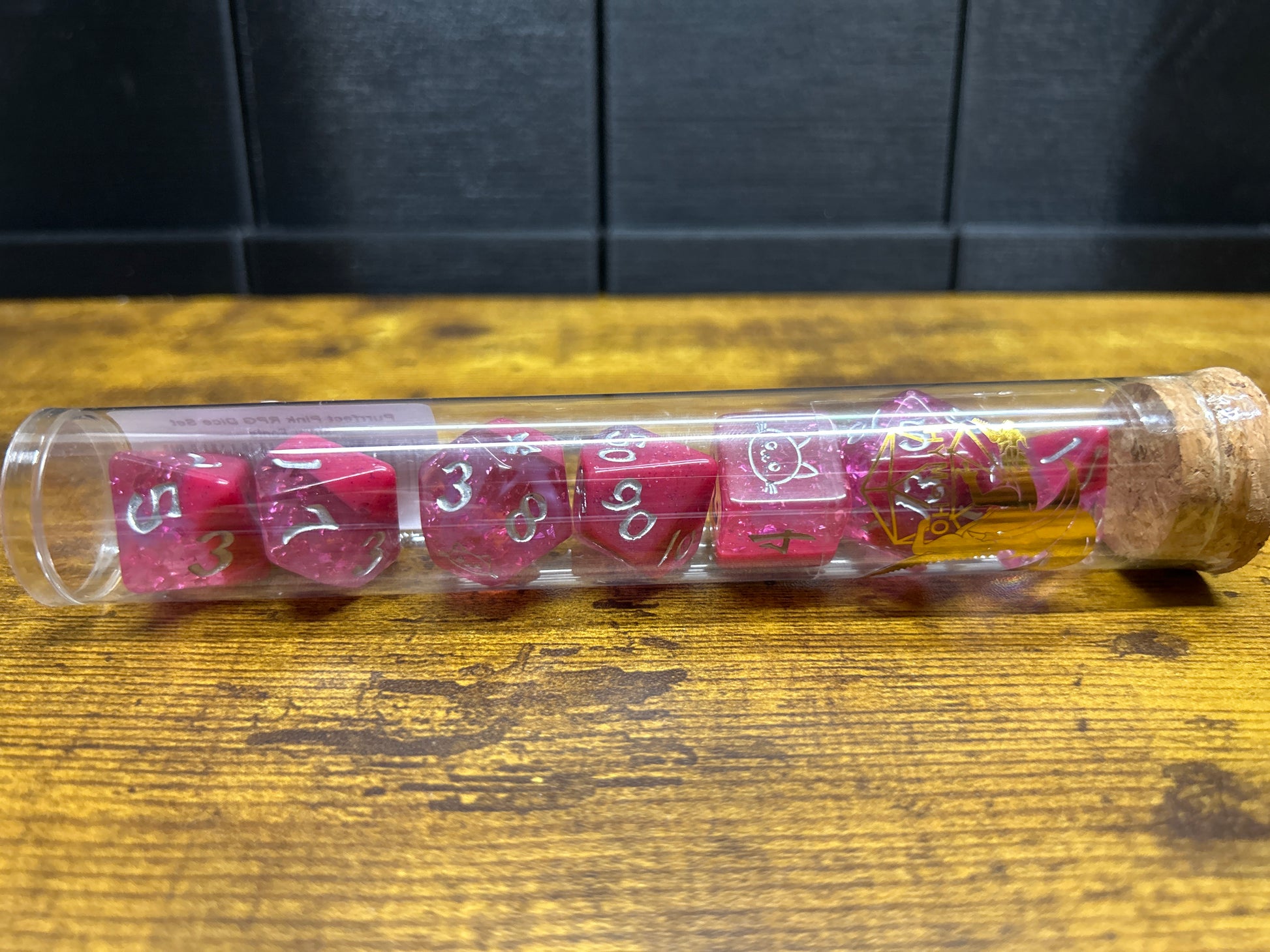 7-Set “Purrfect Pink” RPG Dice by Wyrmforged. 1d20, 1d%, 1d12, 1d10, 1d8, 1d6, 1d4. Semi-clear and solid pink mixed with Pink glitter.