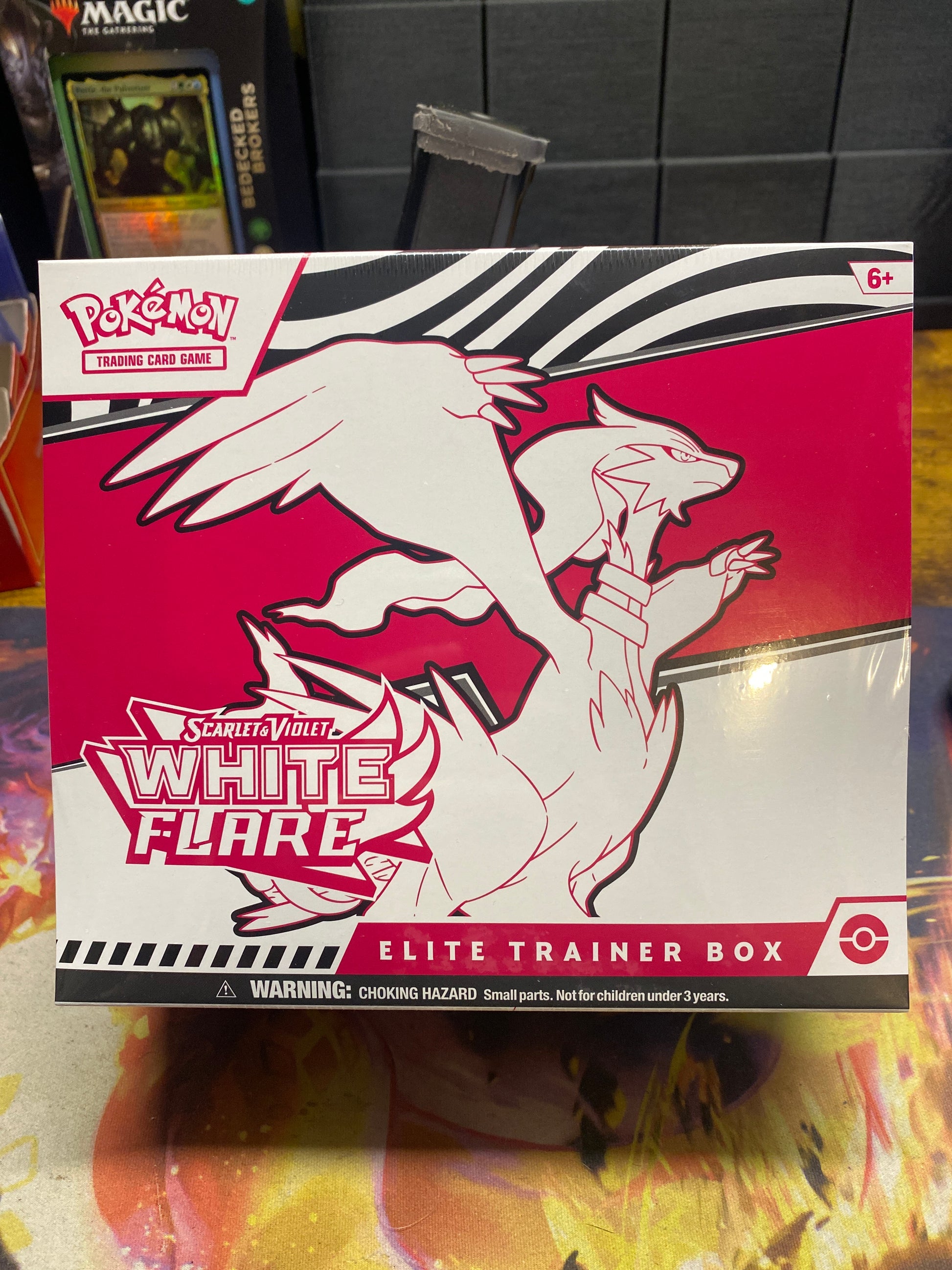 The product is a sealed and an unopened Pokemon Elite Trainer Box (ETB) featuring the White Flare set from the Black Bolt collection. Manufactured by Nintendo under the Pokemon franchise, this non-sport trading card pack is sure to contain exclusive and highly sought-after cards for collectors and fans of the Pokemon series. |