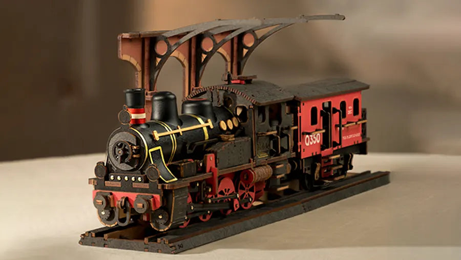 The Rolife Steam Journey is a wooden miniature of a European-inspired vintage locomotive. The model includes the engine, a passenger cart, tracks, and a train station.